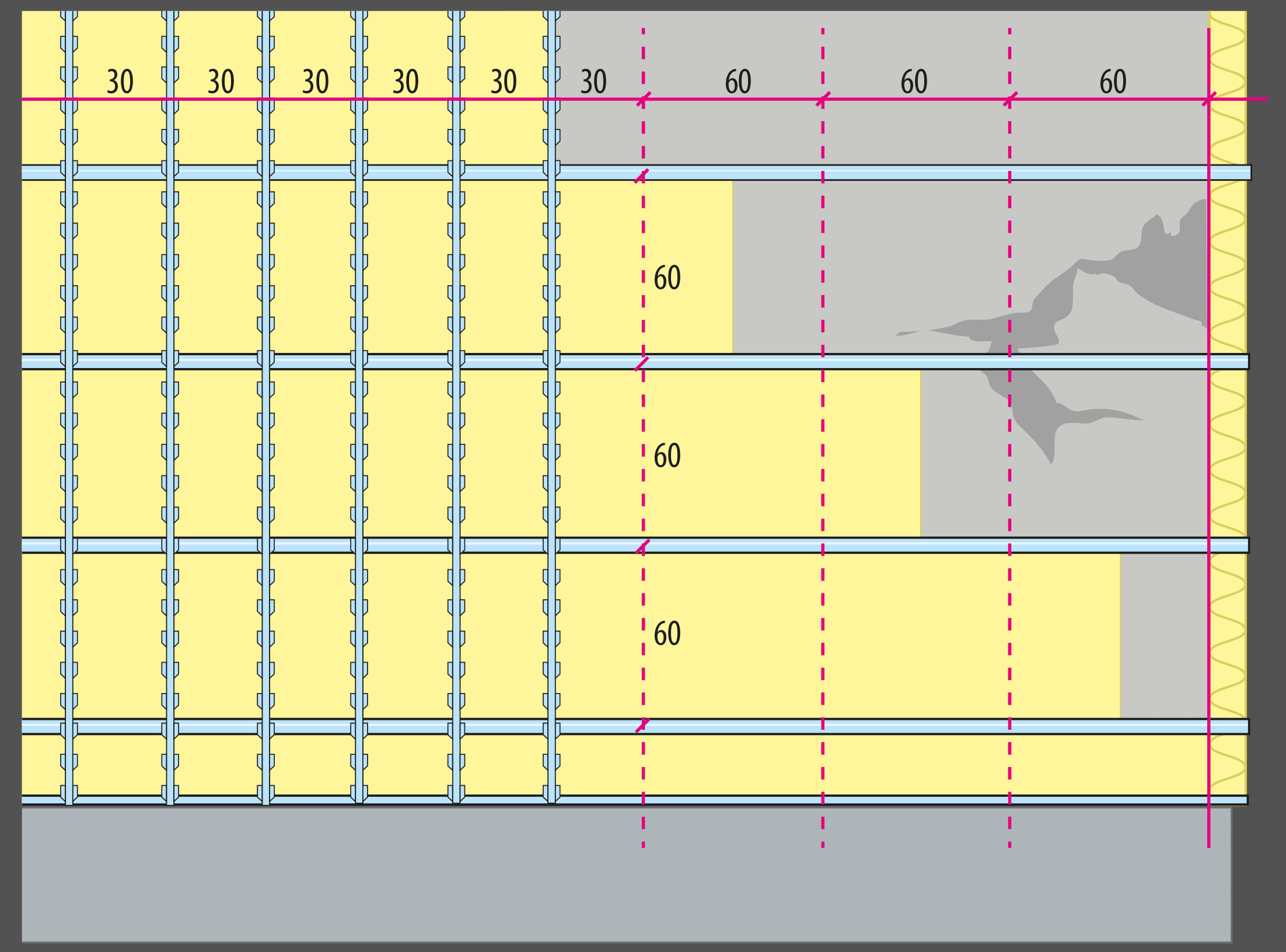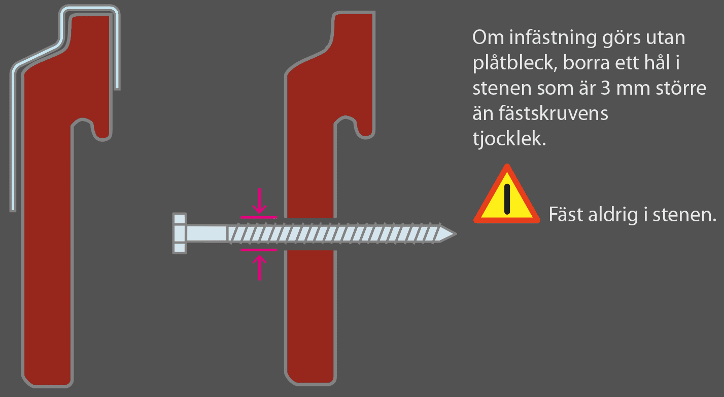 Välj en klaffregel med samma tjocklek som isoleringen. Reglarna fästes horisontellt, max 60 cm från varandra. Komplettera vid öppningar för att fästa monteringsprofilerna. Kontrollera att den nya fasaden blir plan samt fyll eventuella håligheter med stödplattor vid infästningspunkterna.